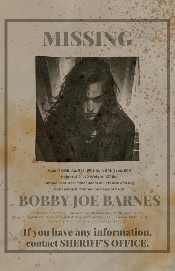 BOB JOSEPH BARNES, also known as: Bobby Joe, and BJ - was last seen loitering around Susanna's Drive-In Diner on JULY 9th 1965.Left anywhere from 6-8 pm based on conflicting reports.Suspected runaway case.UPDATE(s):- Reported alive in 1981, having allegedly fathered one (1) child.