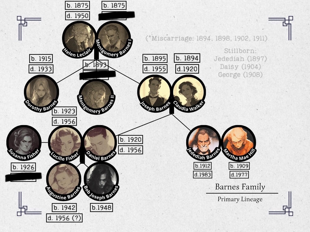 Augustine known as Gus. ‘Uncle Auggie’Jedediah (1912) named after great grandpapa’s deceased brother.Helen, Claudia, and Lucille from other founding families of Angeltop Valley (where my father was born) - Barnes Estate owned motel, currently operated by Harold Newman.Great Auntie Susanna still runs diner in Angeltop, she’s a pistol!